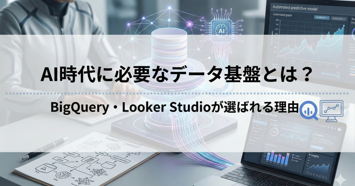 本記事では、AI時代のマーケティングに不可欠な「データ基盤」とは何かを解説し、なぜ多くの企業がGoogleのBigQueryとLooker Studioを選んでいるのか、その理由を詳しくお伝えします。さらに、広告運用担当者がすぐに実践できる「AI-Ready」なデータ環境の構築方法もご紹介します。