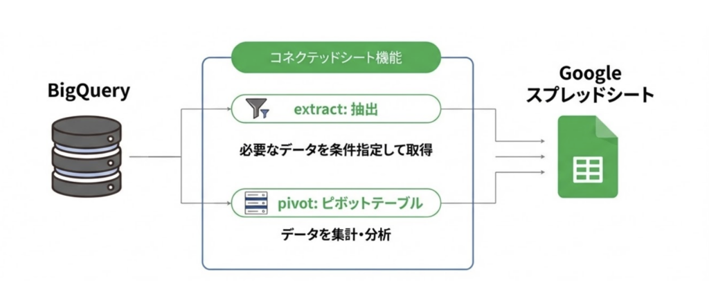 BigQueryに蓄積されたデータを、Googleスプレッドシートの「コネクテッドシート」機能で直接参照します。コネクテッドシートはBigQueryのデータを「表示」する仕組みで、シート自体にデータを保持しません。そのため、数十万行のデータでもスプレッドシートが重くなることなく、最新データが自動的に反映されます。