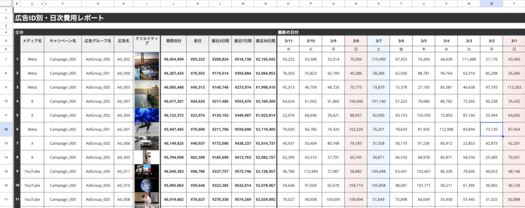 広告ID単位で、クリエイティブのサムネイル画像とともに日別の費用データを一覧表示するレポートです。期間合計、前日、直近3日間、直近7日間、直近30日間のデータを並べることで、どのクリエイティブにどの程度投資しているかを視覚的に把握できます。