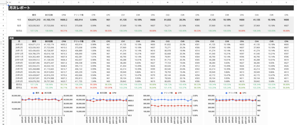 全体の期間サマリー、今週と前週の比較、日別のKPI一覧をまとめたレポートです。費用、表示回数、CPM、クリック数、CTR、CPC、CV、CVR、CPAなど主要指標を網羅し、前週比の変動も自動計算されます。