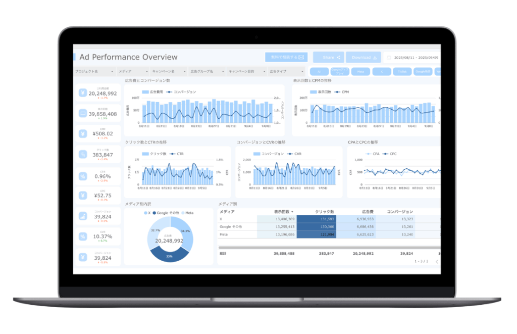 デジタル広告運用においてレポートは、広告の分析をする上で成功の鍵を握る重要な要素です。特に複数の広告媒体を運用している場合、データを集約して管理・分析することで、より精度の高い施策改善が可能となります。