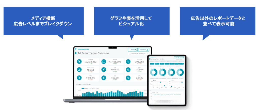 例えば、複数媒体のデータ統合については、Robomaが提供する「広告ダッシュボード for Looker Studio」を活用することで、技術的なハードルを下げながらレポート環境を構築できます。