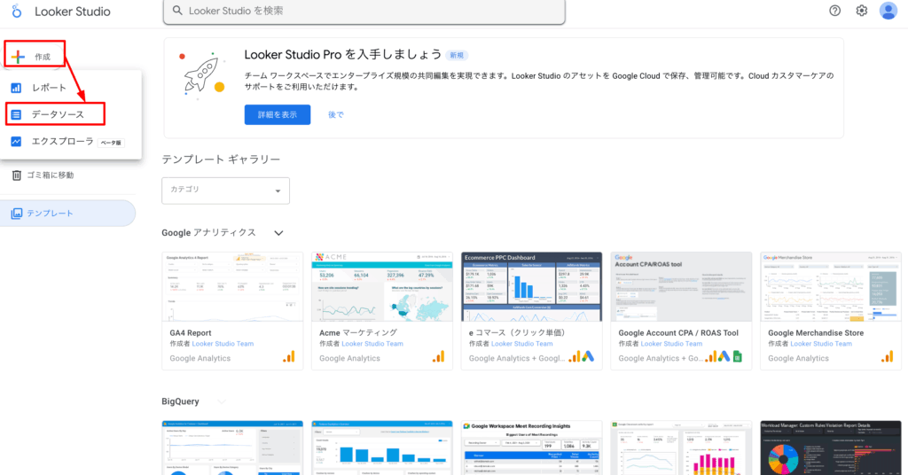 まず、WebブラウザからLooker Studioにアクセスします。Googleアカウントでログインし、Looker Studioのホーム画面を表示させます。