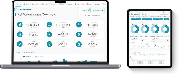 レポート上でコンバージョン数、CPA、ROAS、インプレッション数、クリック数など各広告案件のKPIを明確にし、一目で理解できるように可視化することが重要です。